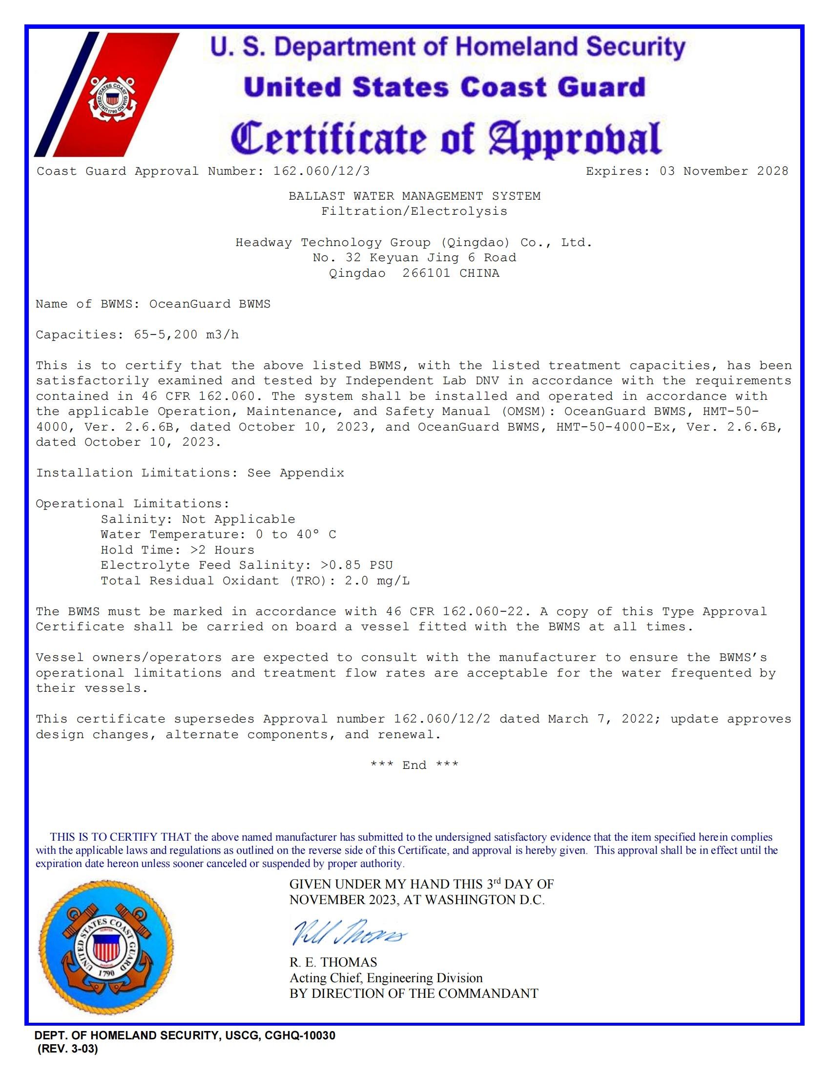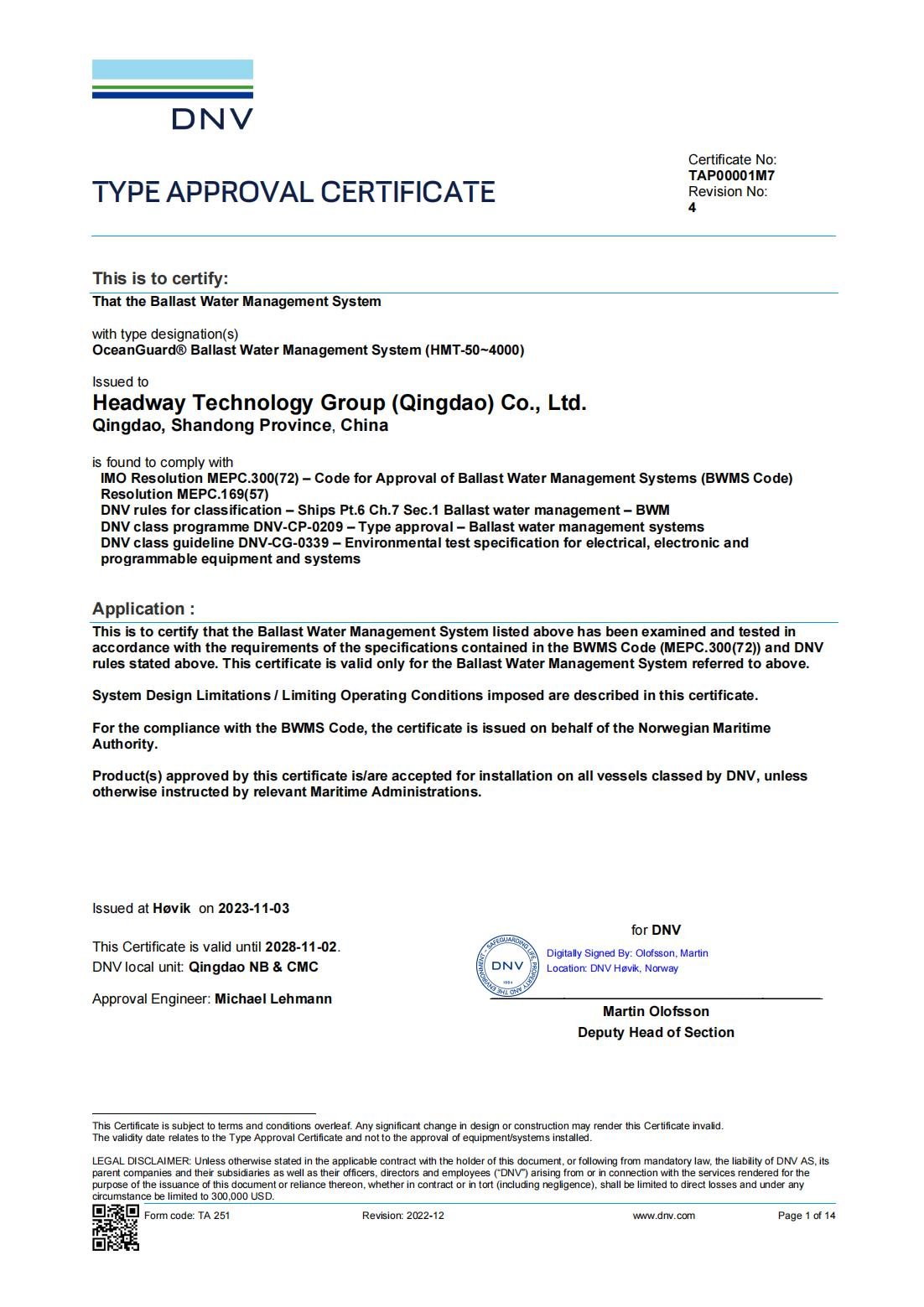 海洋衛(wèi)士?壓載水管理系統(tǒng)(BWMS)采用“電催化高級(jí)氧化技術(shù)”,具有單次處理、體積小、無(wú)氫氣、超低能耗,以及不受水域鹽度、溫度、濁度影響等優(yōu)勢(shì)。系統(tǒng)擁有涵蓋近20個(gè)主流船級(jí)社和船旗國(guó)在內(nèi)的全面認(rèn)證,訂單量與市場(chǎng)份額穩(wěn)居世界前列。
